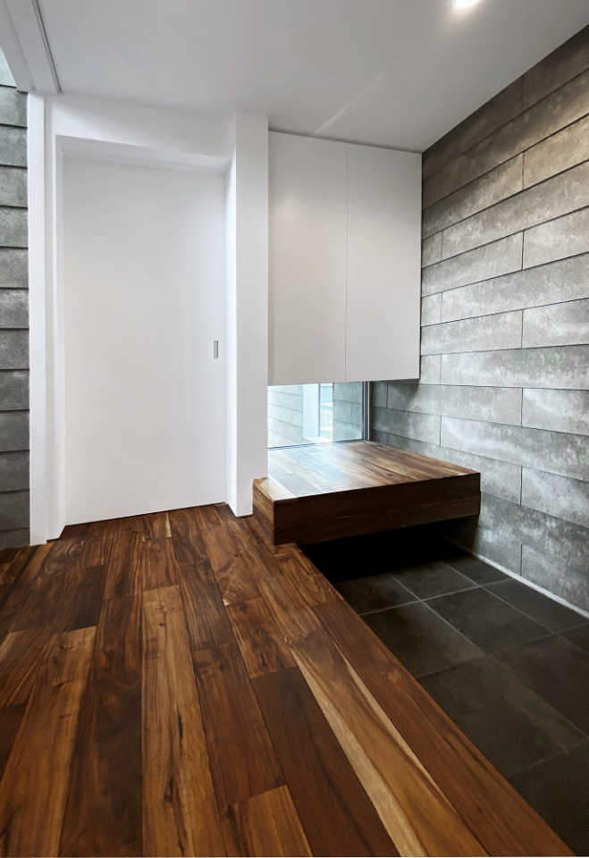 玄関の広がりを視覚的な操作を利用して、外壁と内壁の仕上がりを同じ材質で繋げ、その流れ意識できる位置に地窓を設けています。